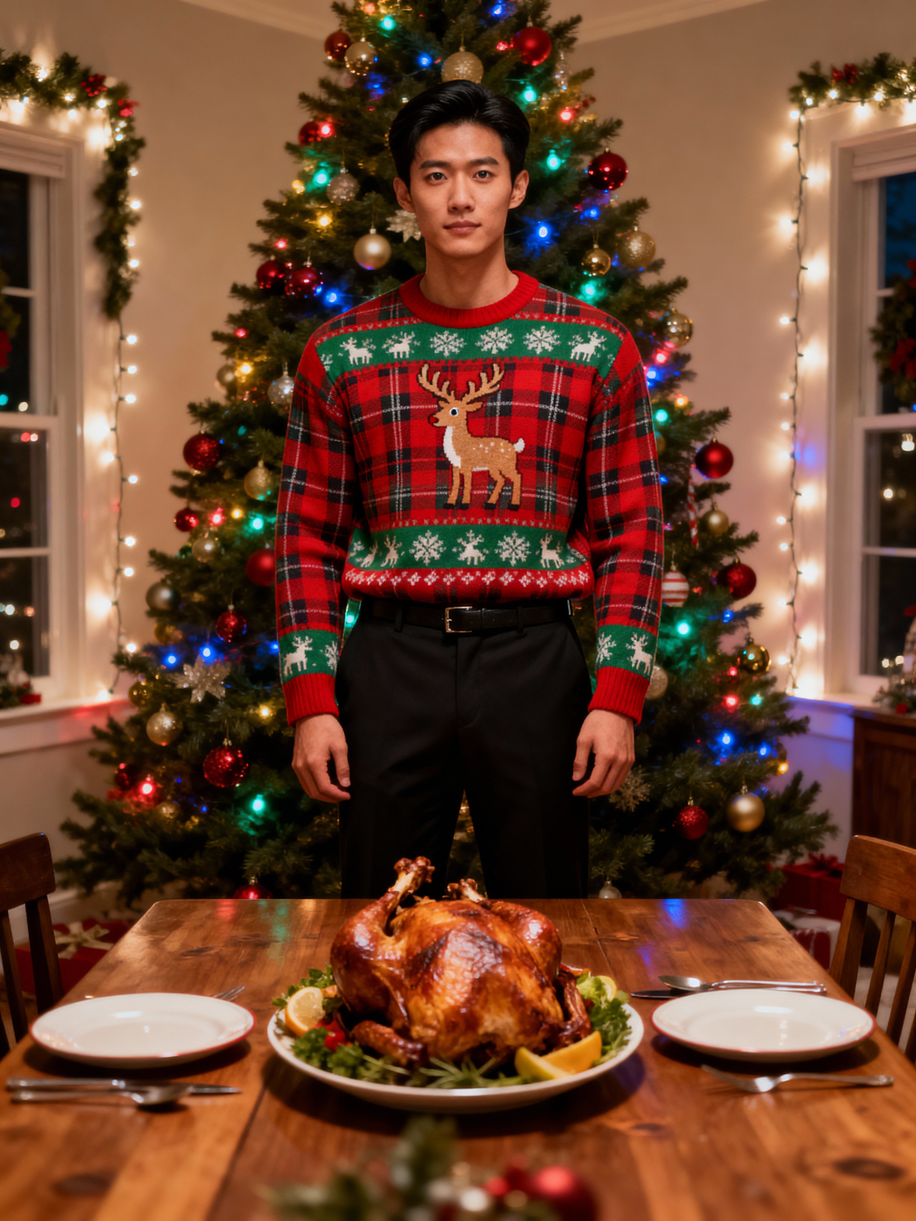 model at Christmas dinner wearing Christmas style clothes. Christmas tree in background. Christmas lights
