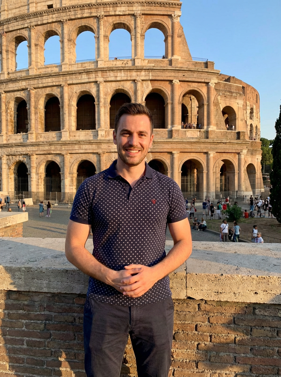 model at Colosseum Rome, ancient amphitheater backdrop, stylish Italian summer outfit, golden hour lighting