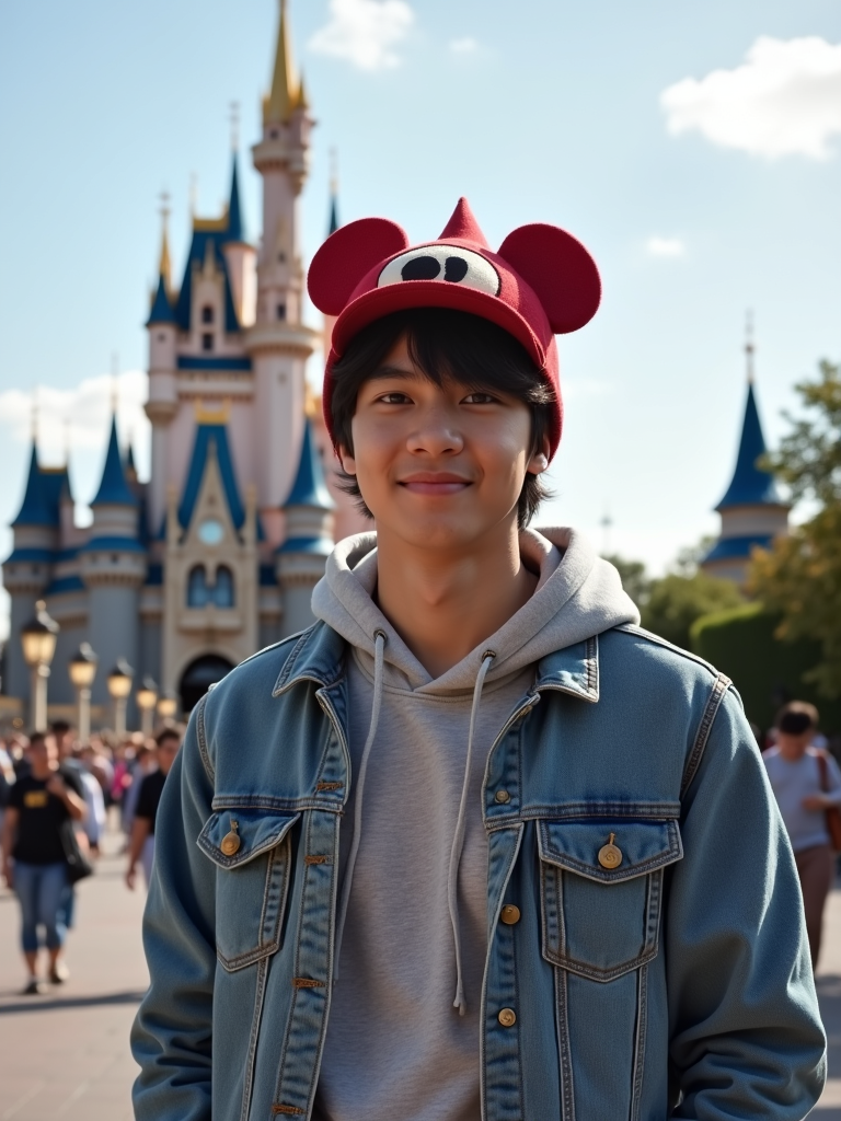 model at Disneyland Paris, wearing casual Disney fan wear with character hat, castle in background