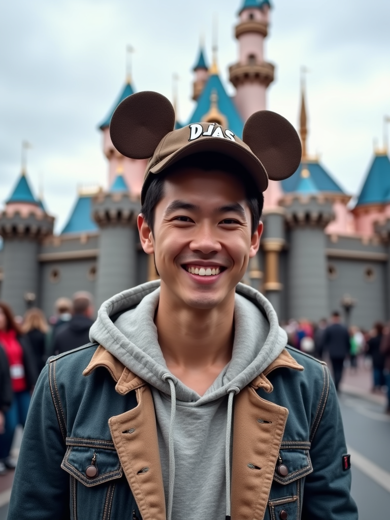model at Disneyland Paris, wearing casual Disney fan wear with character hat, castle in background