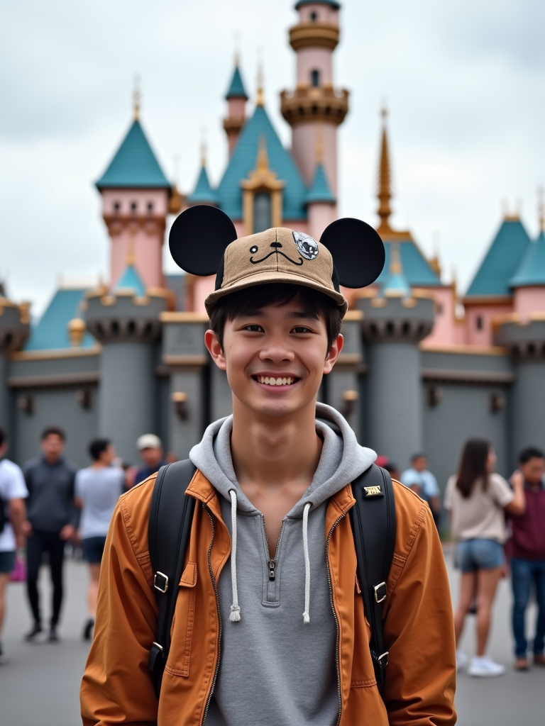model at Disneyland Paris, wearing casual Disney fan wear with character hat, castle in background