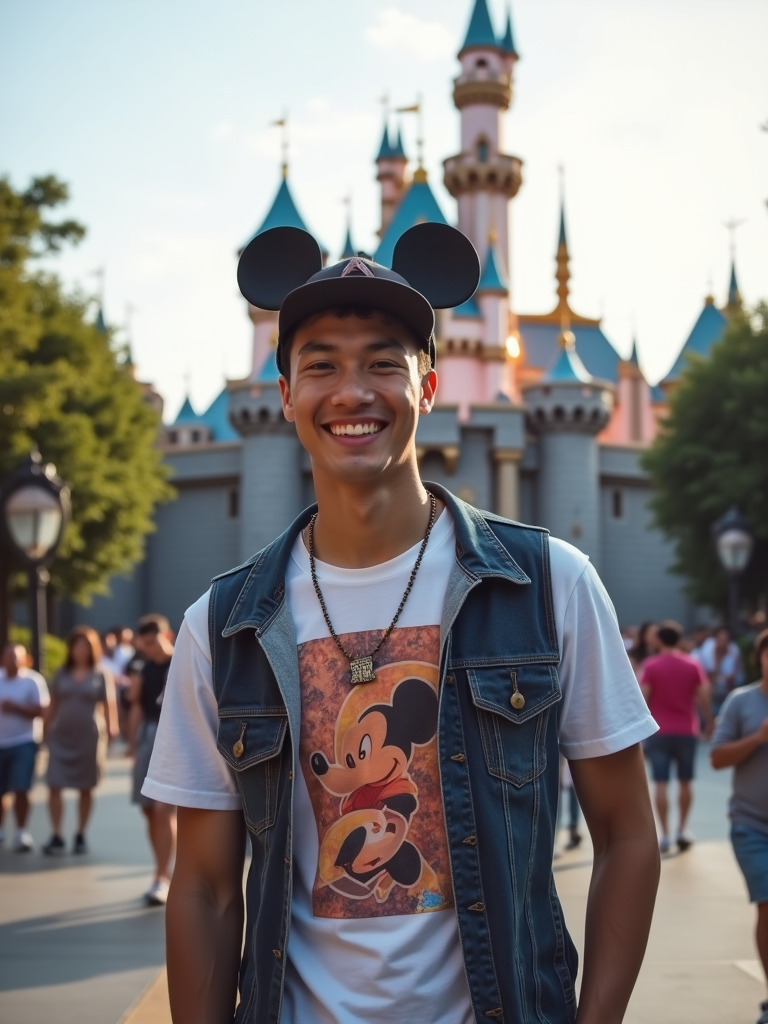 model at Disneyland Paris, wearing casual Disney fan wear with character hat, castle in background