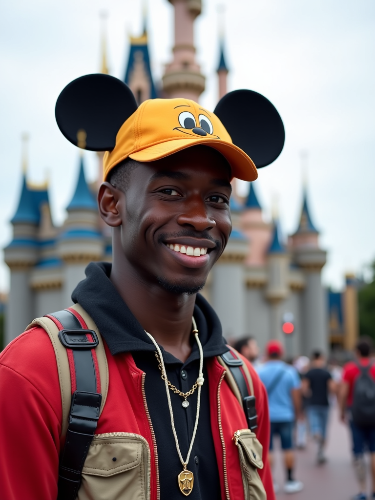 model at Disneyland Paris, wearing casual Disney fan wear with character hat, castle in background