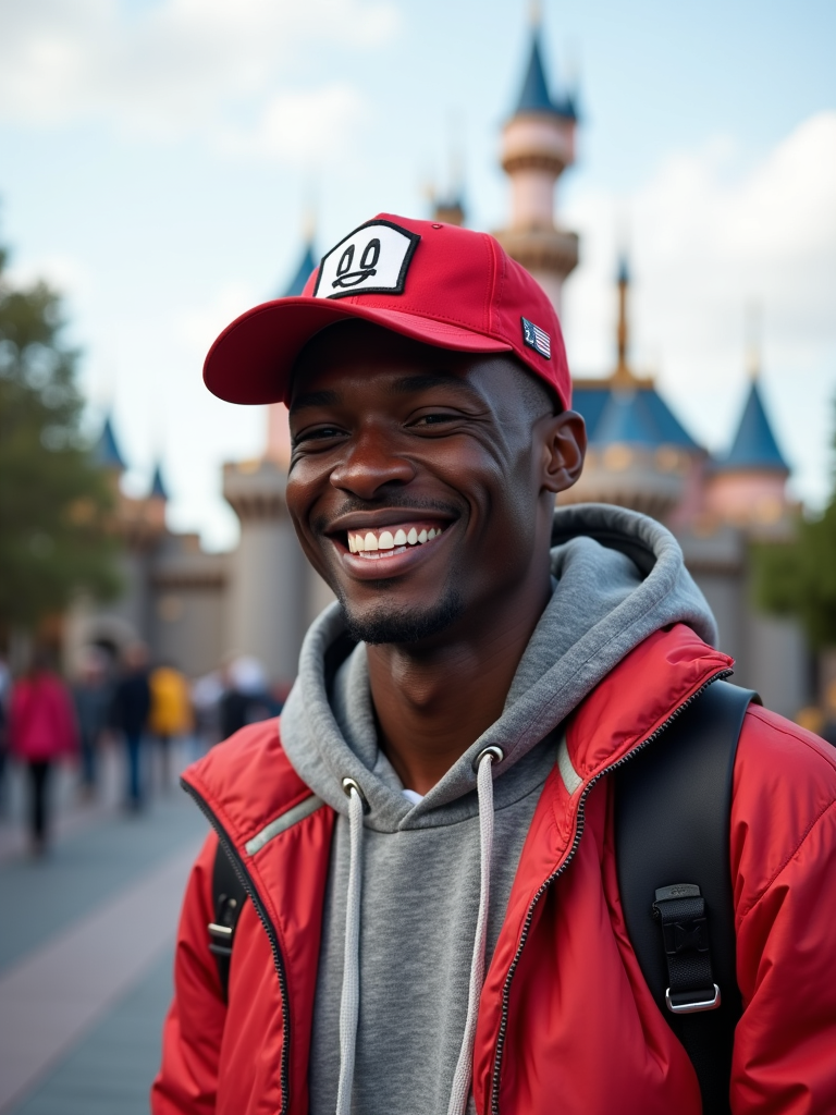 model at Disneyland Paris, wearing casual Disney fan wear with character hat, castle in background