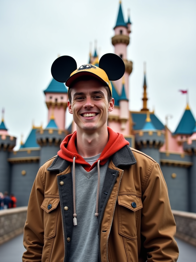 model at Disneyland Paris, wearing casual Disney fan wear with character hat, castle in background