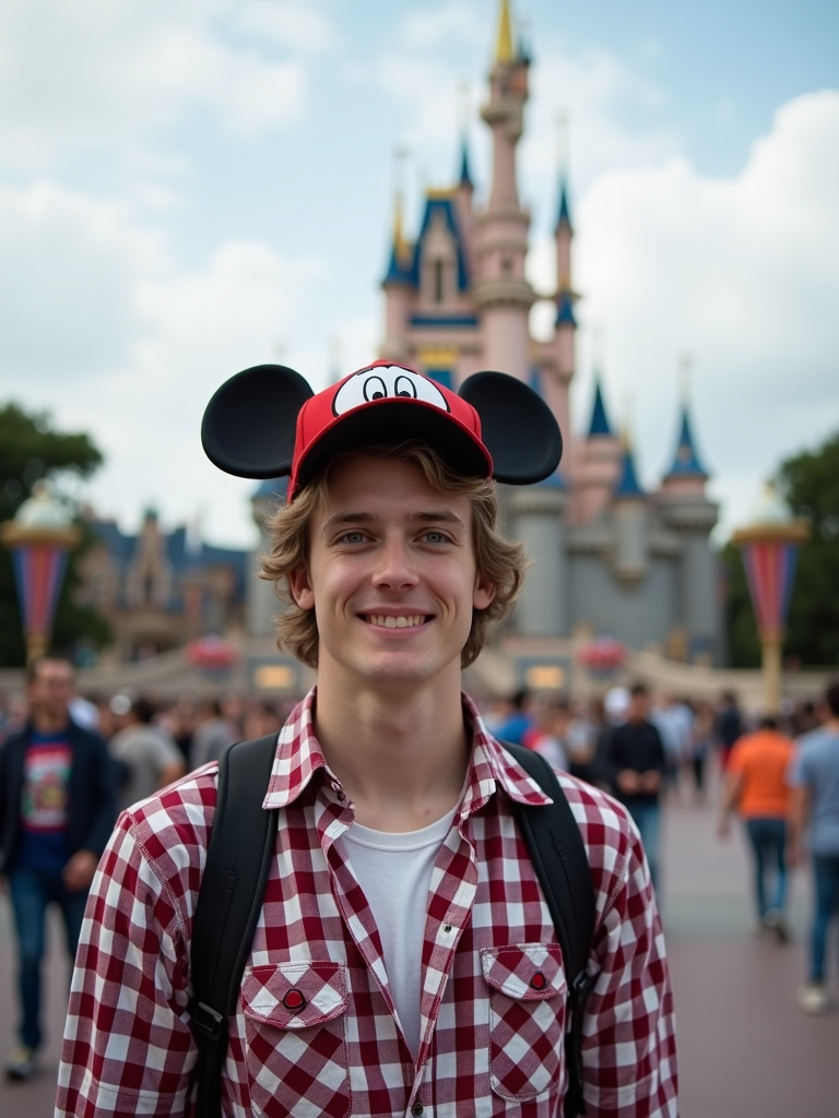 model at Disneyland Paris, wearing casual Disney fan wear with character hat, castle in background