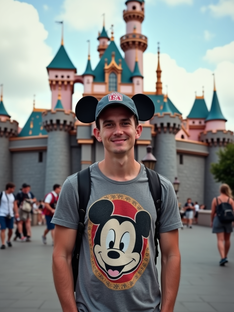 model at Disneyland Paris, wearing casual Disney fan wear with character hat, castle in background