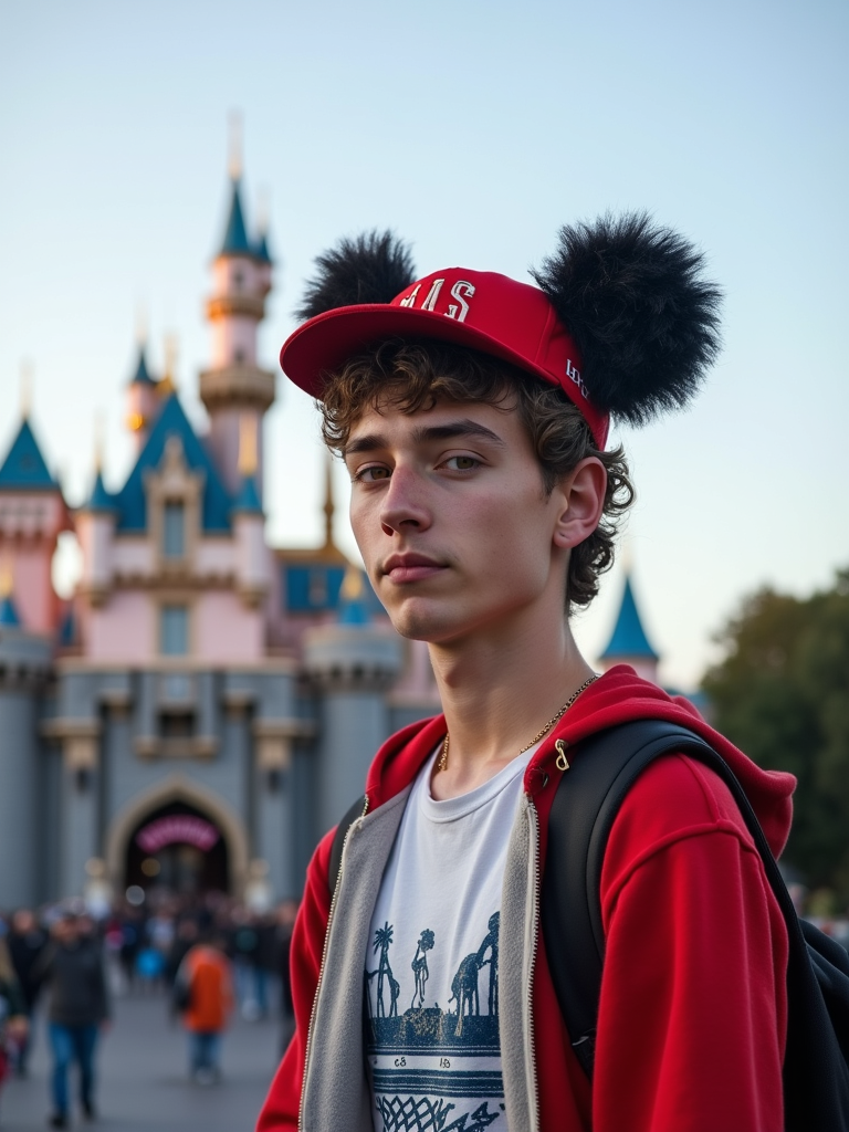 model at Disneyland Paris, wearing casual Disney fan wear with character hat, castle in background