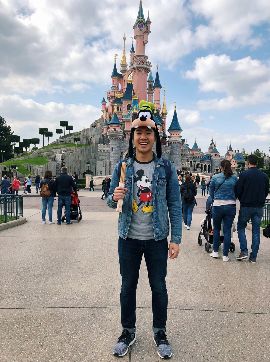 model at Disneyland Paris, wearing casual Disney fan wear with character hat, castle in background