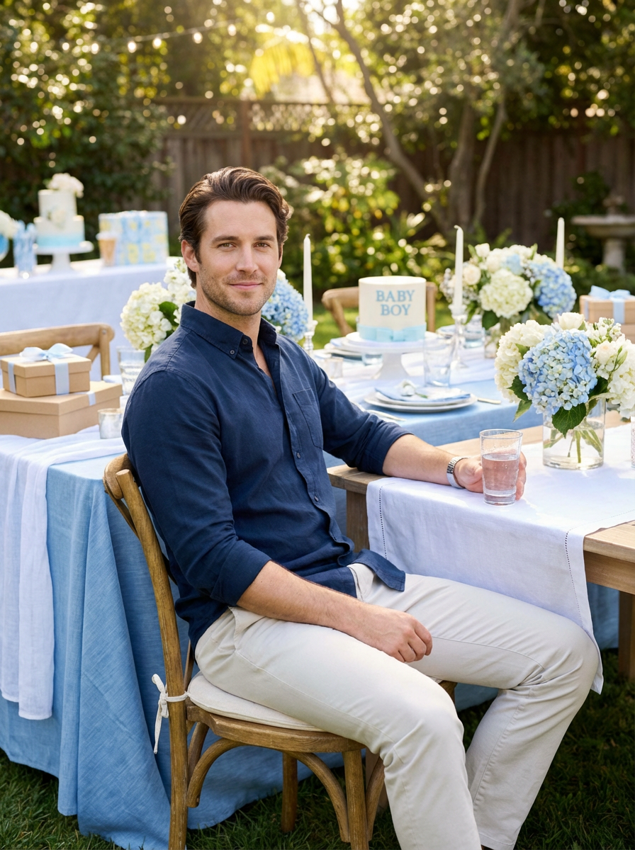 model at elegant baby shower brunch, sophisticated table setting, garden party aesthetic