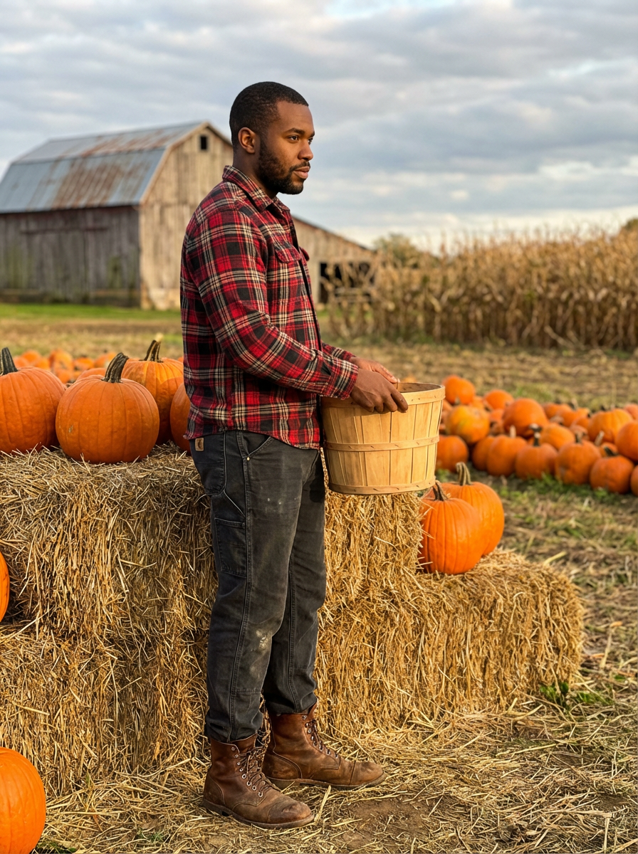 model at farm harvest scene, hay bales and pumpkins, flannel shirt, rustic autumn setting