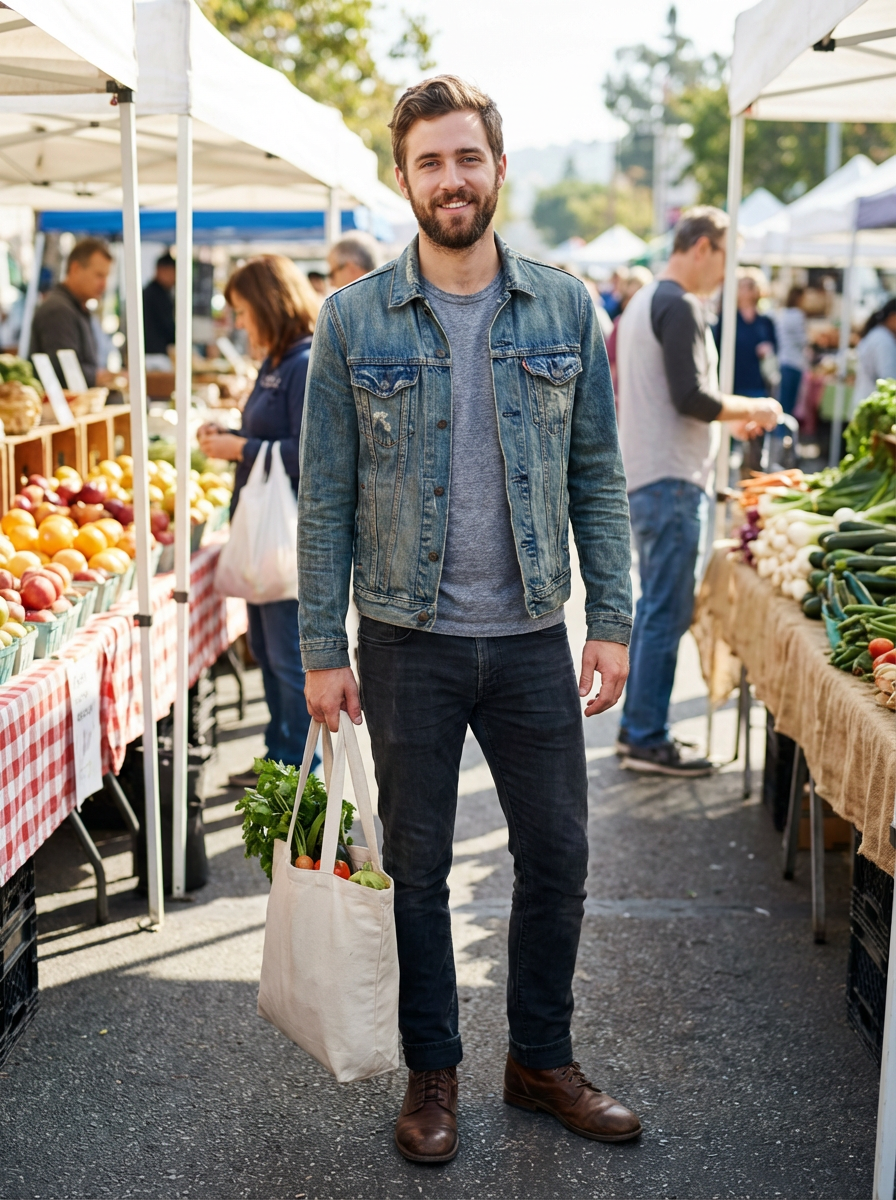 model at farmers market, healthy lifestyle, casual weekend outfit, natural authentic setting