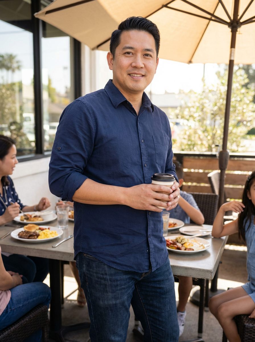 model at Fathers Day brunch, restaurant setting, family gathering, smart casual attire