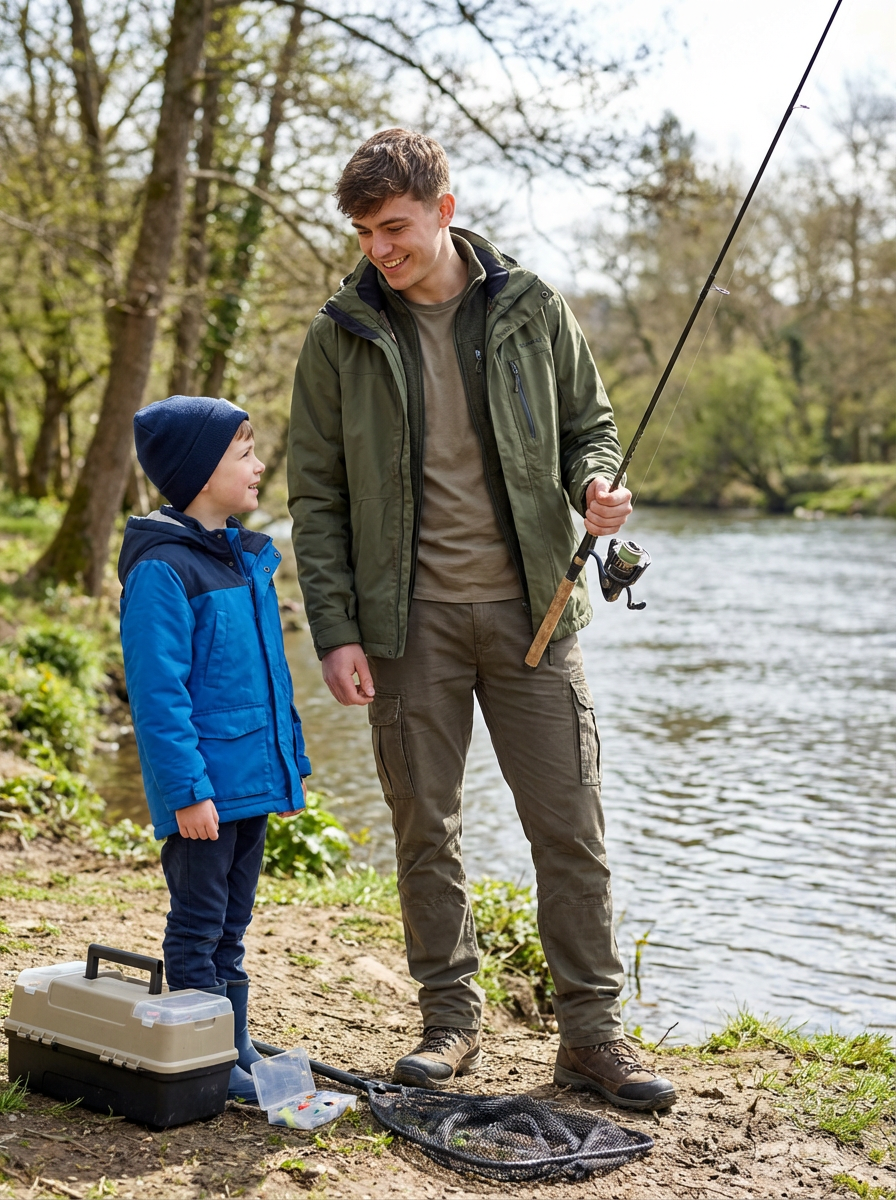 model at fishing spot, father-child bonding, casual outdoor gear, lake or river setting
