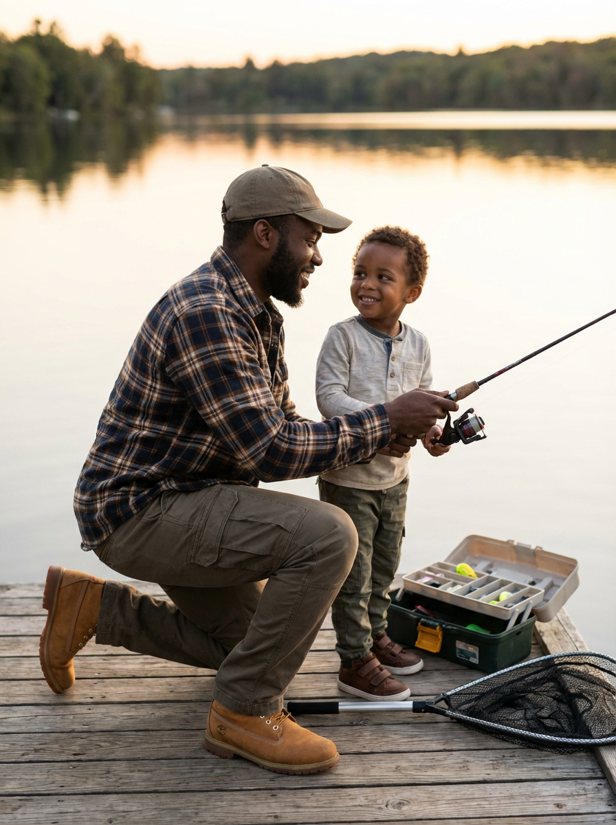 model at fishing spot, father-child bonding, casual outdoor gear, lake or river setting