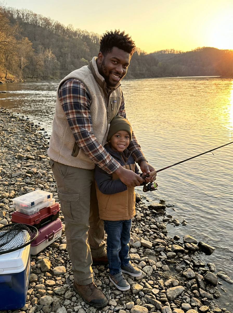 model at fishing spot, father-child bonding, casual outdoor gear, lake or river setting