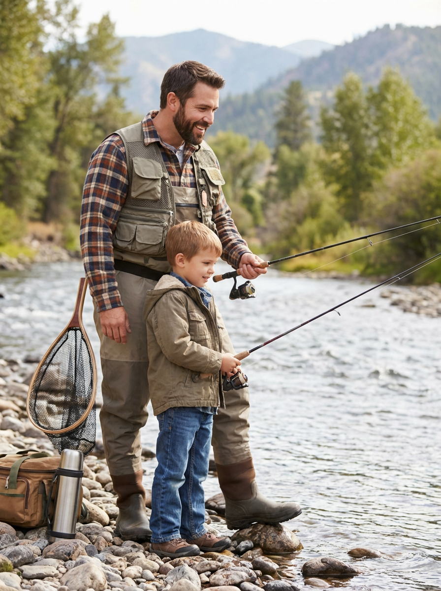 model at fishing spot, father-child bonding, casual outdoor gear, lake or river setting
