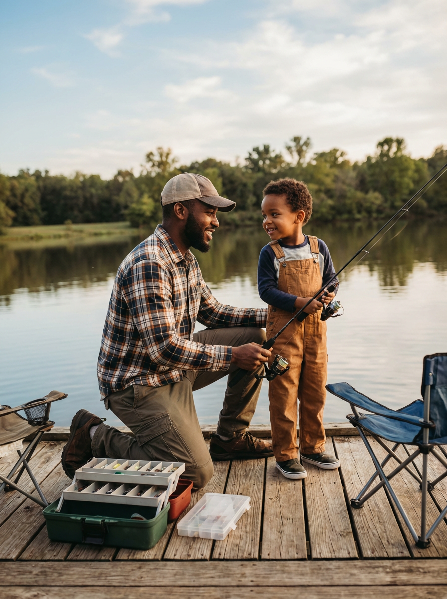 model at fishing spot, father-child bonding, casual outdoor gear, lake or river setting