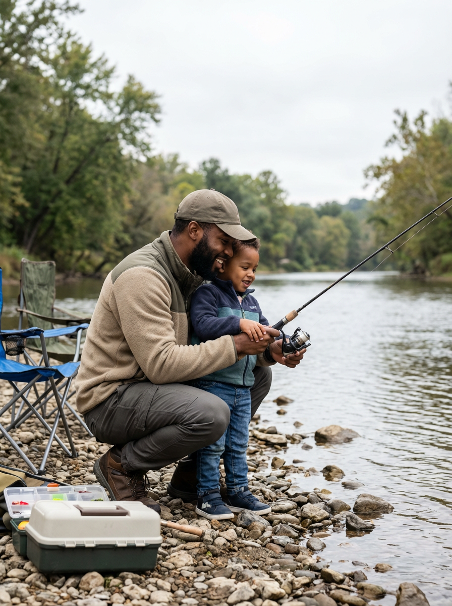 model at fishing spot, father-child bonding, casual outdoor gear, lake or river setting
