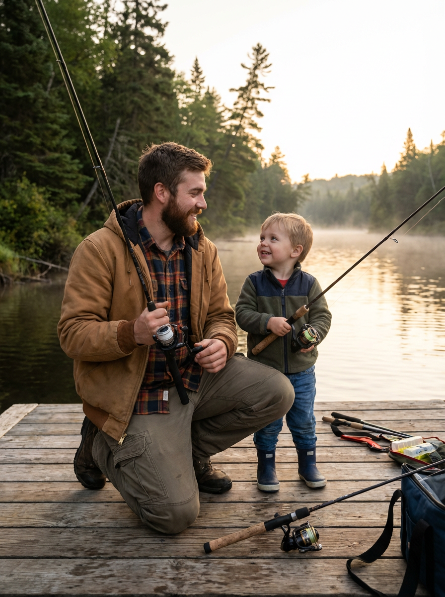 model at fishing spot, father-child bonding, casual outdoor gear, lake or river setting