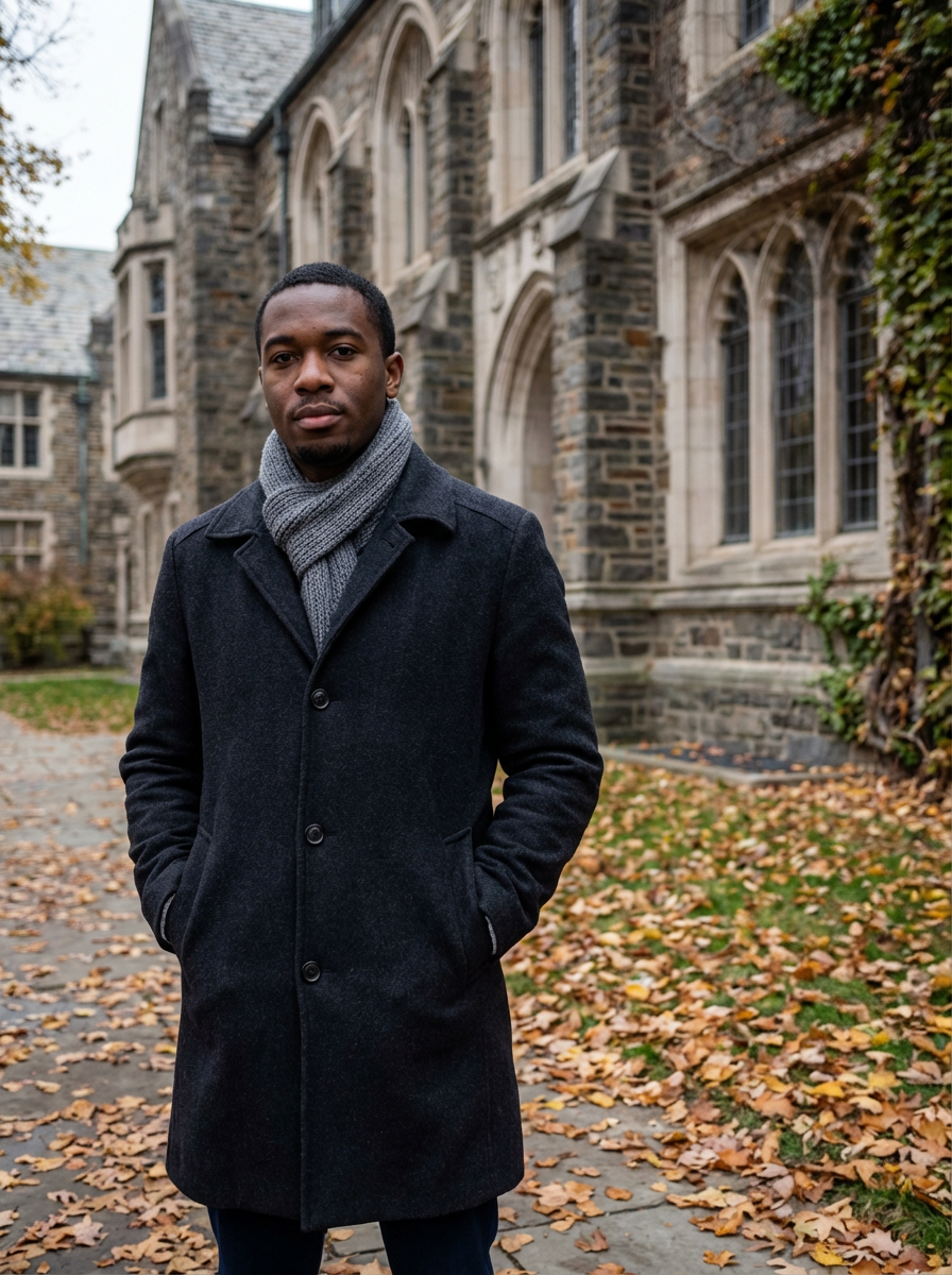 model at gothic university, dark academia fashion, wool coat, scarf, autumn leaves, old stone buildings