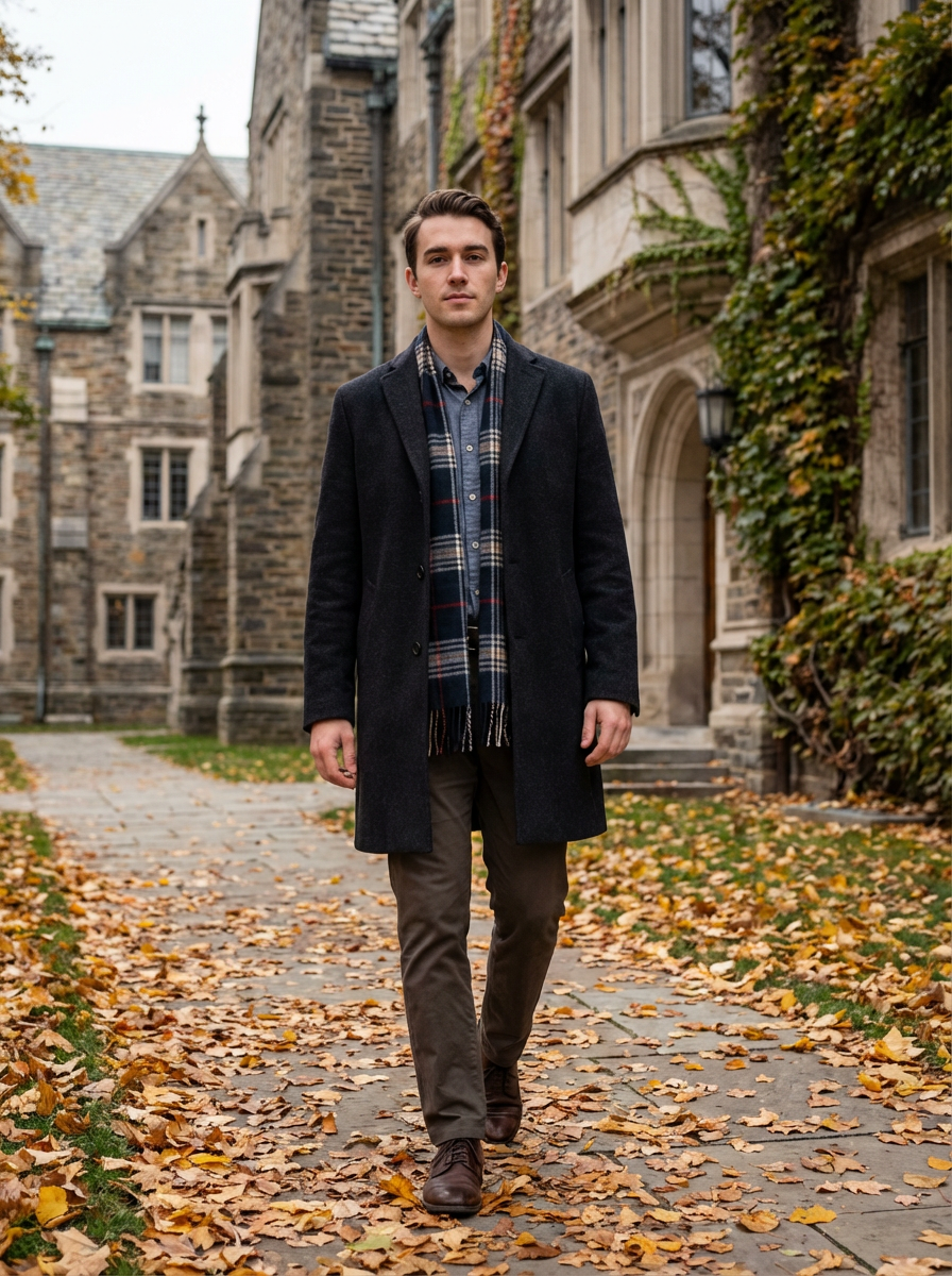model at gothic university, dark academia fashion, wool coat, scarf, autumn leaves, old stone buildings