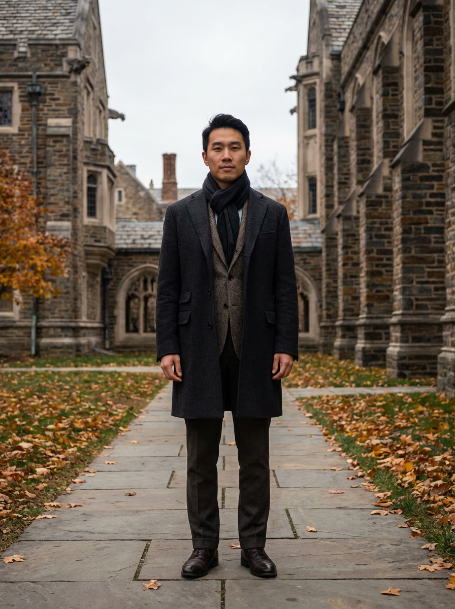 model at gothic university, dark academia fashion, wool coat, scarf, autumn leaves, old stone buildings
