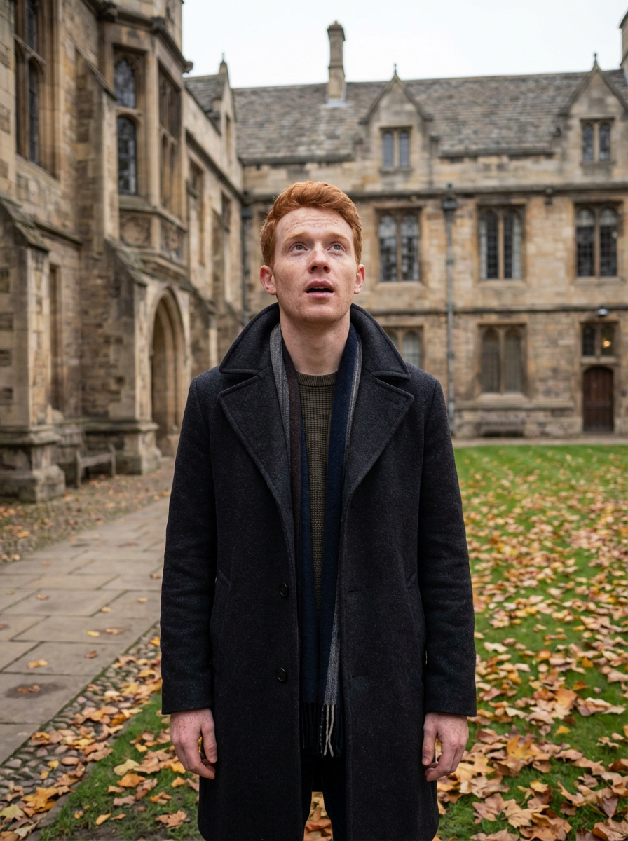 model at gothic university, dark academia fashion, wool coat, scarf, autumn leaves, old stone buildings