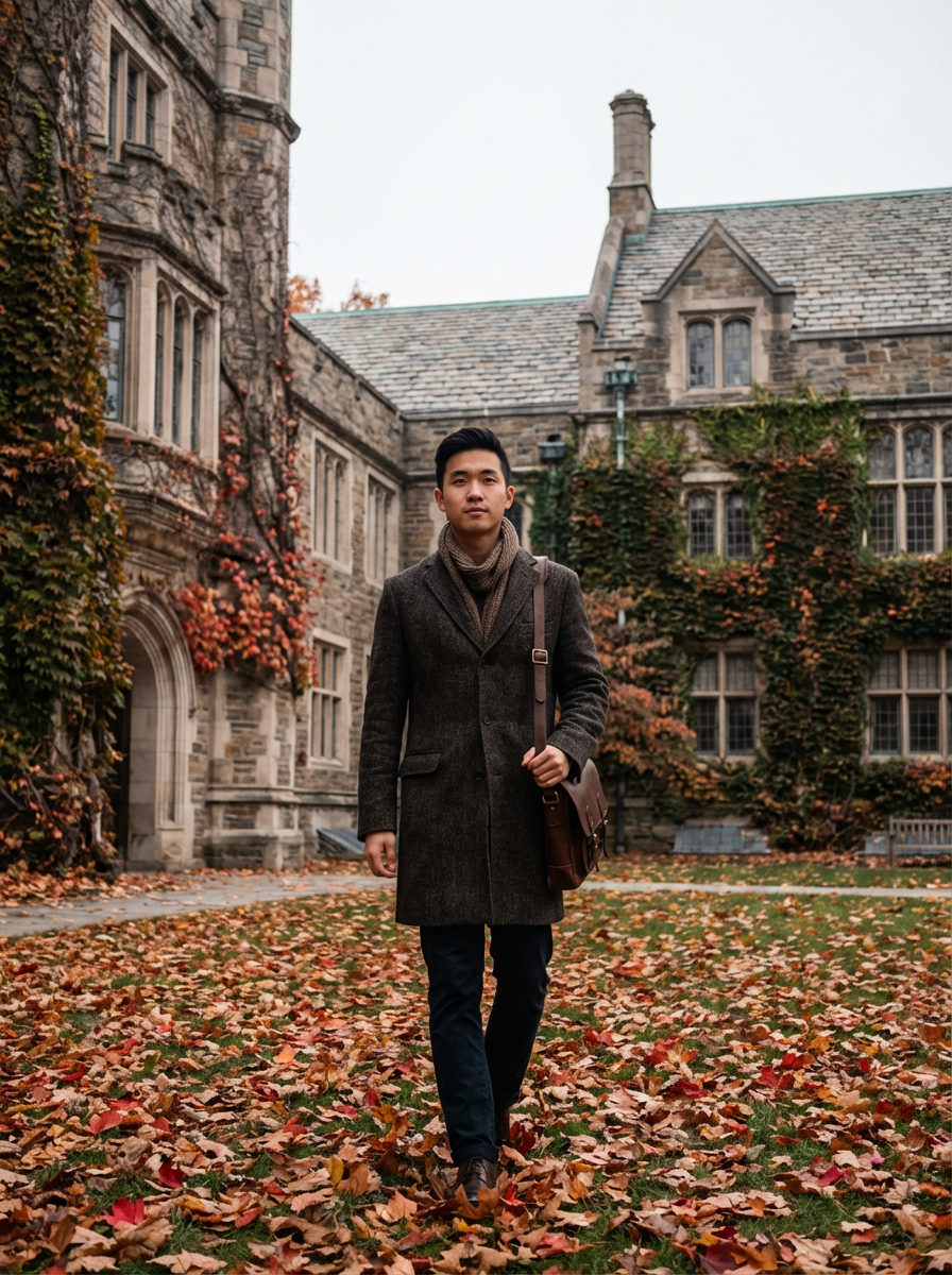 model at gothic university, dark academia fashion, wool coat, scarf, autumn leaves, old stone buildings