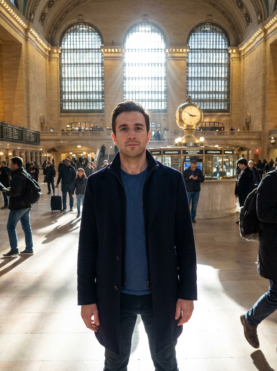 model at Grand Central Terminal, main concourse, elegant travel outfit, dramatic light beams from windows