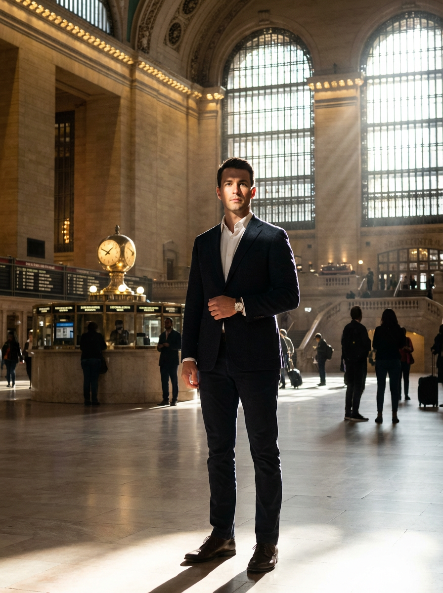model at Grand Central Terminal, main concourse, elegant travel outfit, dramatic light beams from windows