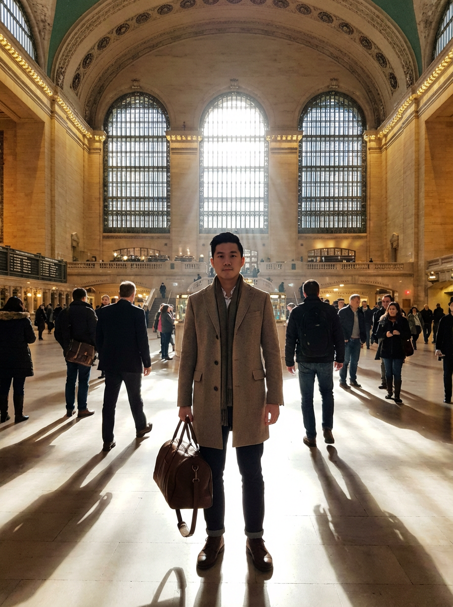 model at Grand Central Terminal, main concourse, elegant travel outfit, dramatic light beams from windows