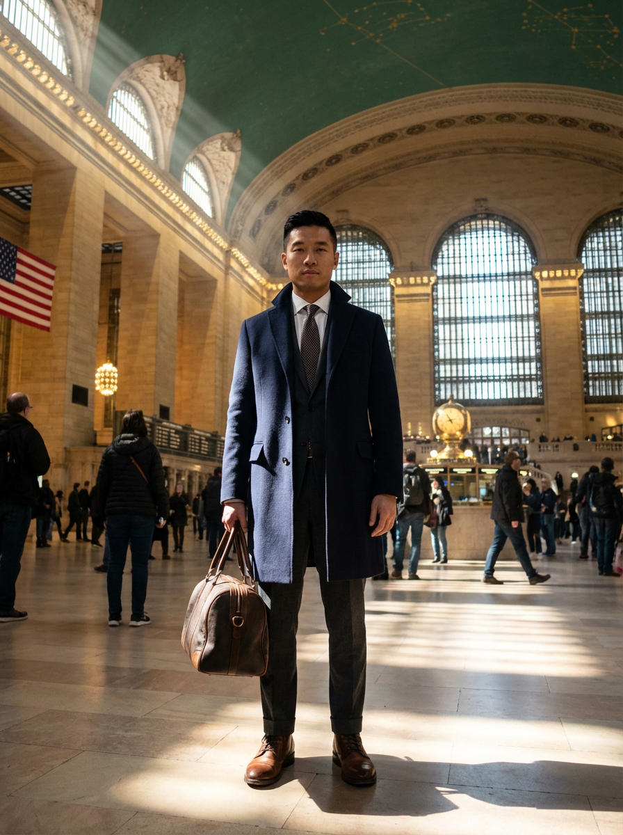 model at Grand Central Terminal, main concourse, elegant travel outfit, dramatic light beams from windows