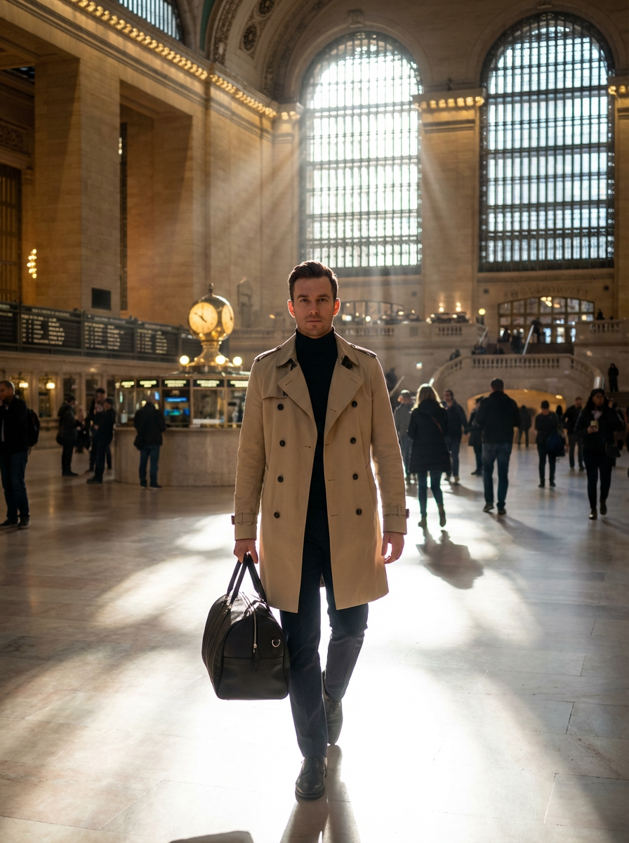 model at Grand Central Terminal, main concourse, elegant travel outfit, dramatic light beams from windows