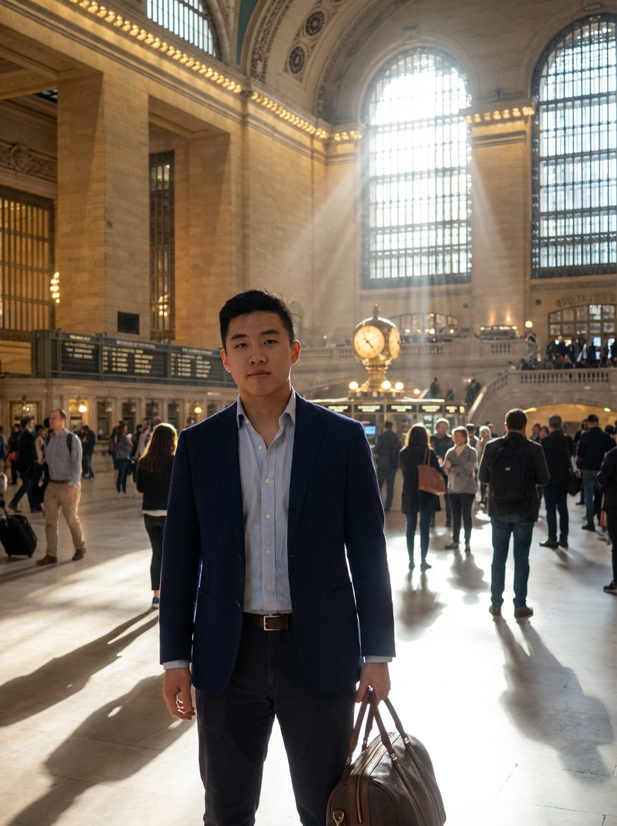 model at Grand Central Terminal, main concourse, elegant travel outfit, dramatic light beams from windows