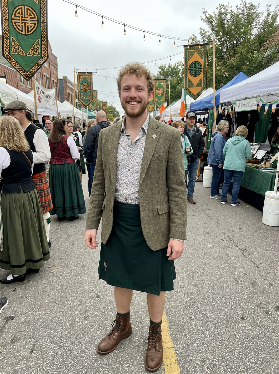 model at Irish heritage celebration, Celtic decorations, traditional and modern mix, proud festive look