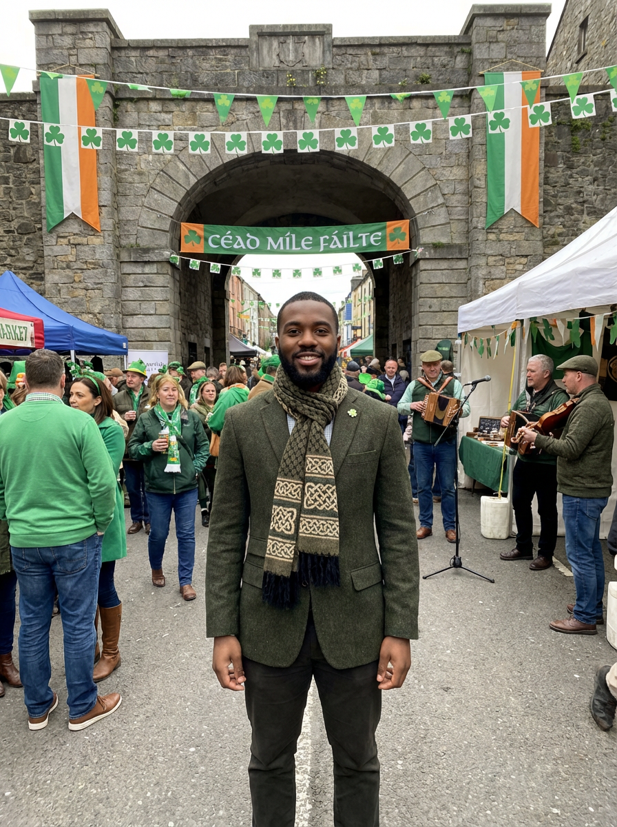 model at Irish heritage celebration, Celtic decorations, traditional and modern mix, proud festive look
