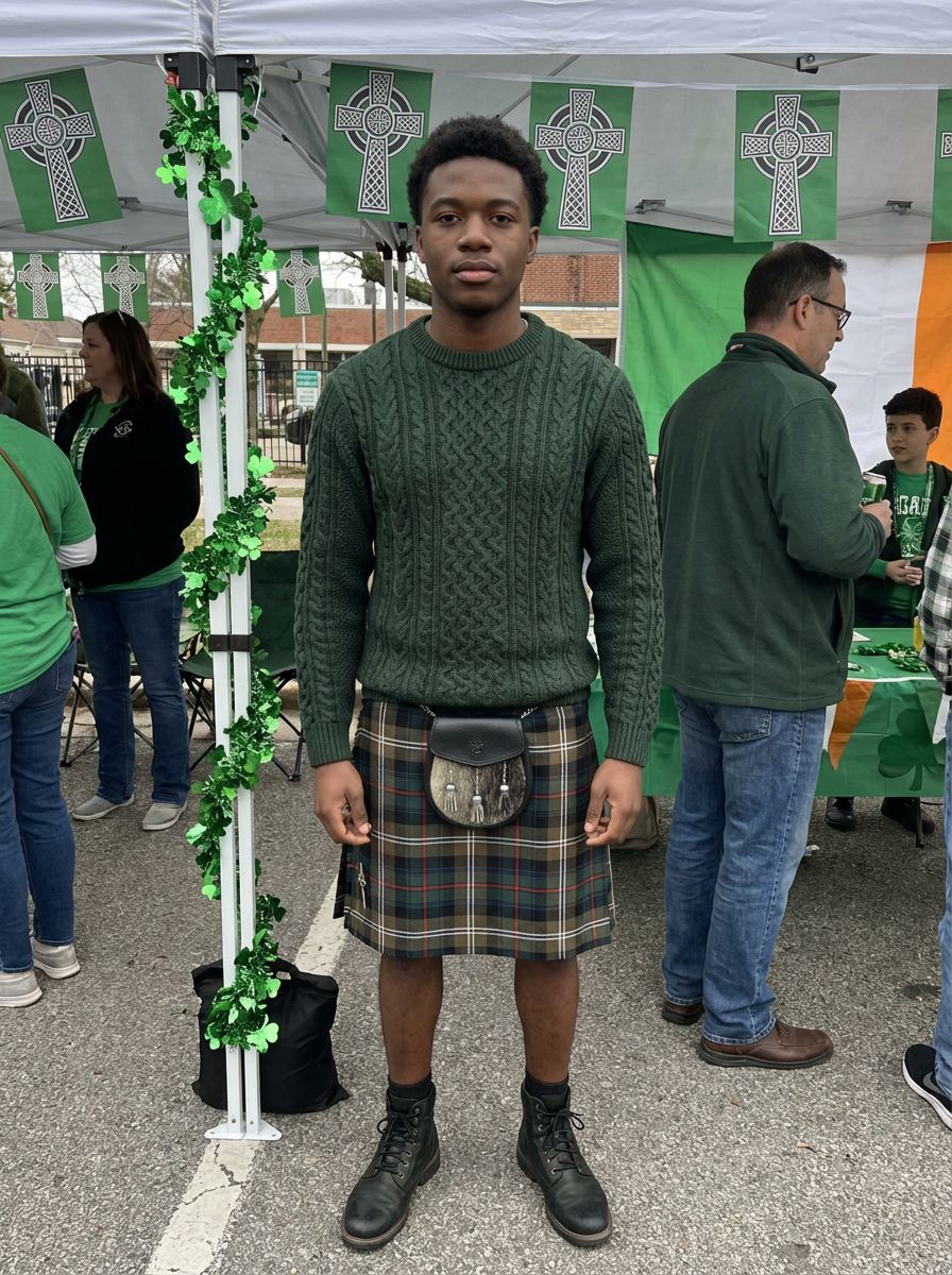 model at Irish heritage celebration, Celtic decorations, traditional and modern mix, proud festive look