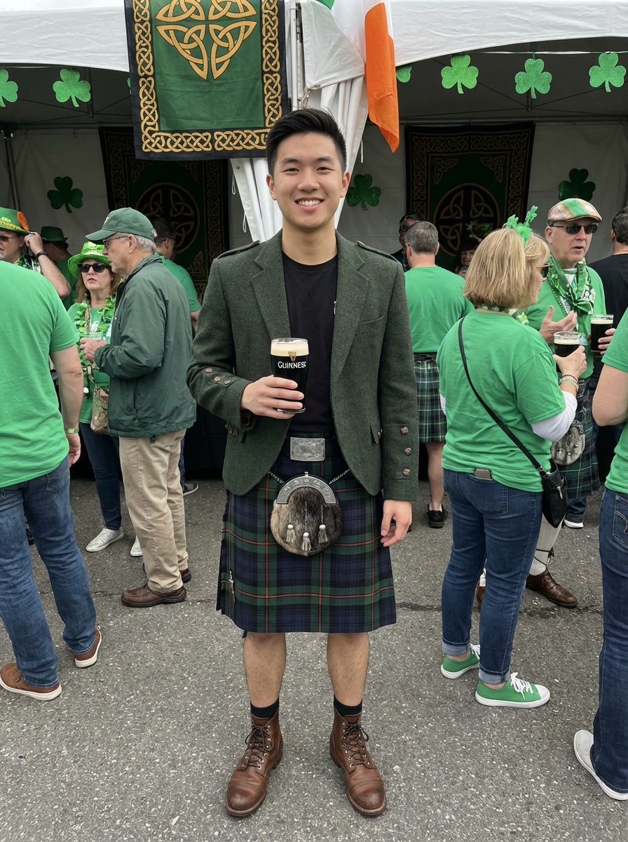 model at Irish heritage celebration, Celtic decorations, traditional and modern mix, proud festive look