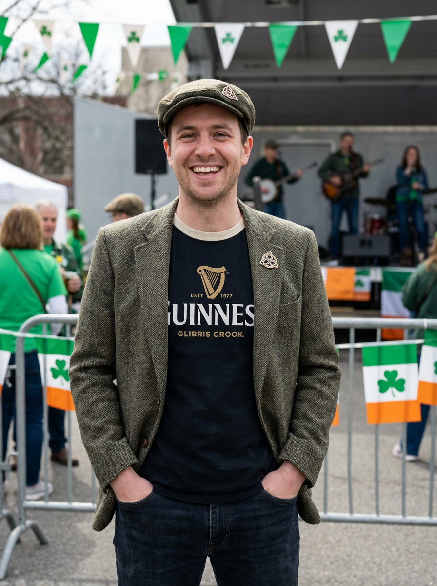 model at Irish heritage celebration, Celtic decorations, traditional and modern mix, proud festive look