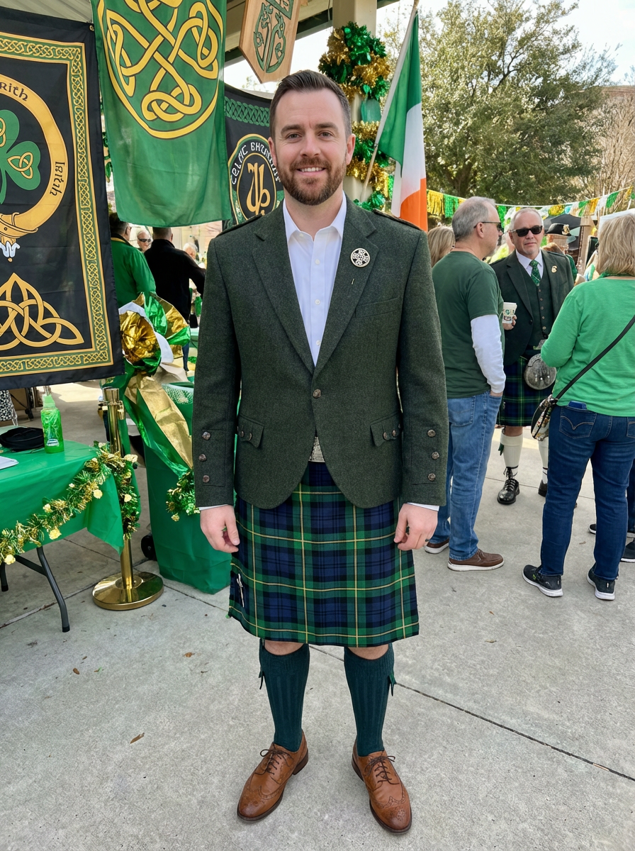 model at Irish heritage celebration, Celtic decorations, traditional and modern mix, proud festive look