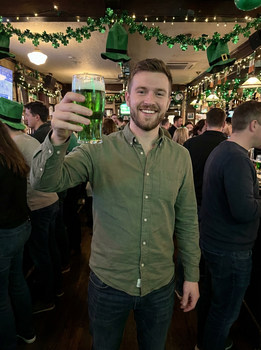 model at Irish pub, green beer, St Patricks Day decorations, pub atmosphere, cheerful toast