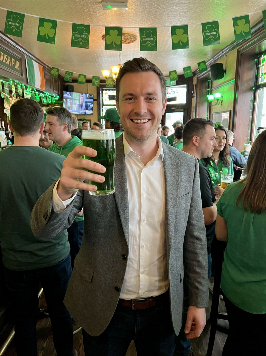 model at Irish pub, green beer, St Patricks Day decorations, pub atmosphere, cheerful toast