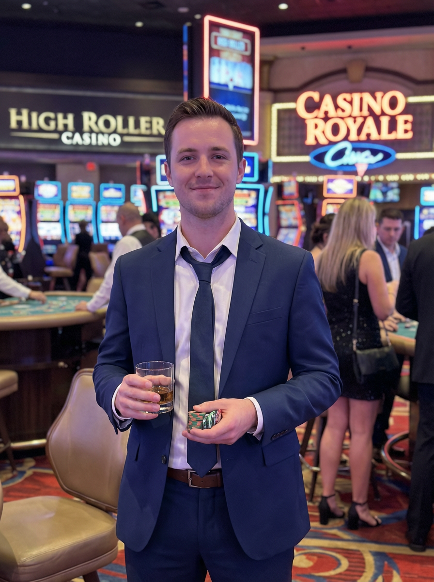 model at Las Vegas bachelor party, casino background, sharp dressed, neon lights, high roller aesthetic