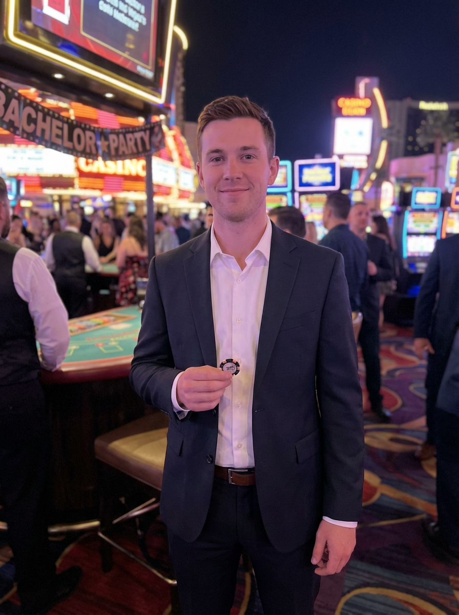 model at Las Vegas bachelor party, casino background, sharp dressed, neon lights, high roller aesthetic