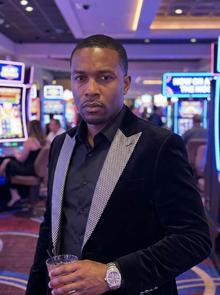 model at Las Vegas bachelor party, casino background, sharp dressed, neon lights, high roller aesthetic