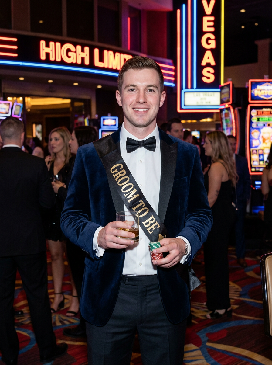model at Las Vegas bachelor party, casino background, sharp dressed, neon lights, high roller aesthetic