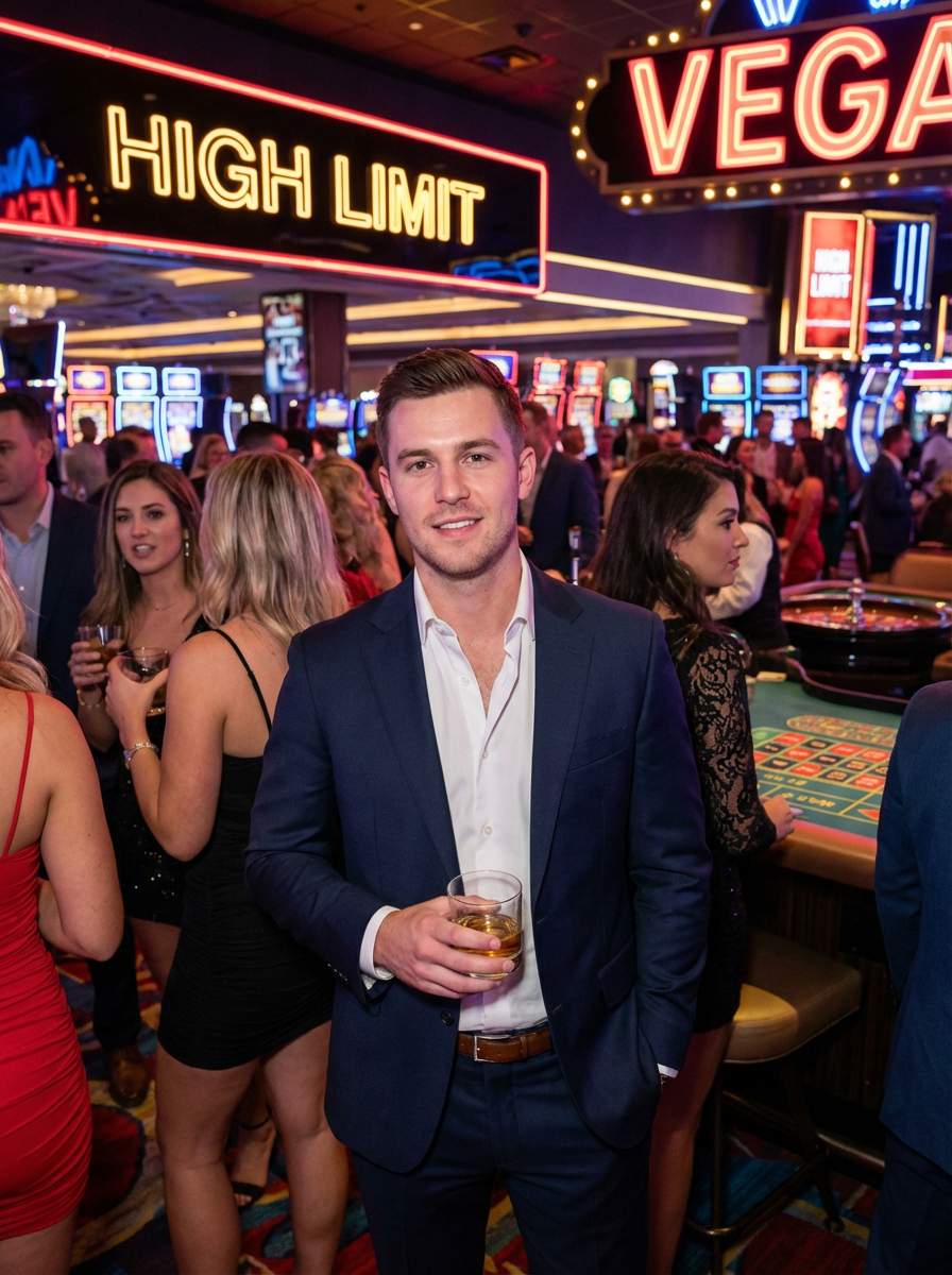 model at Las Vegas bachelor party, casino background, sharp dressed, neon lights, high roller aesthetic