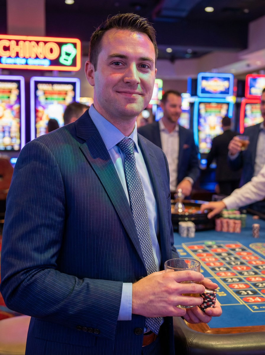 model at Las Vegas bachelor party, casino background, sharp dressed, neon lights, high roller aesthetic
