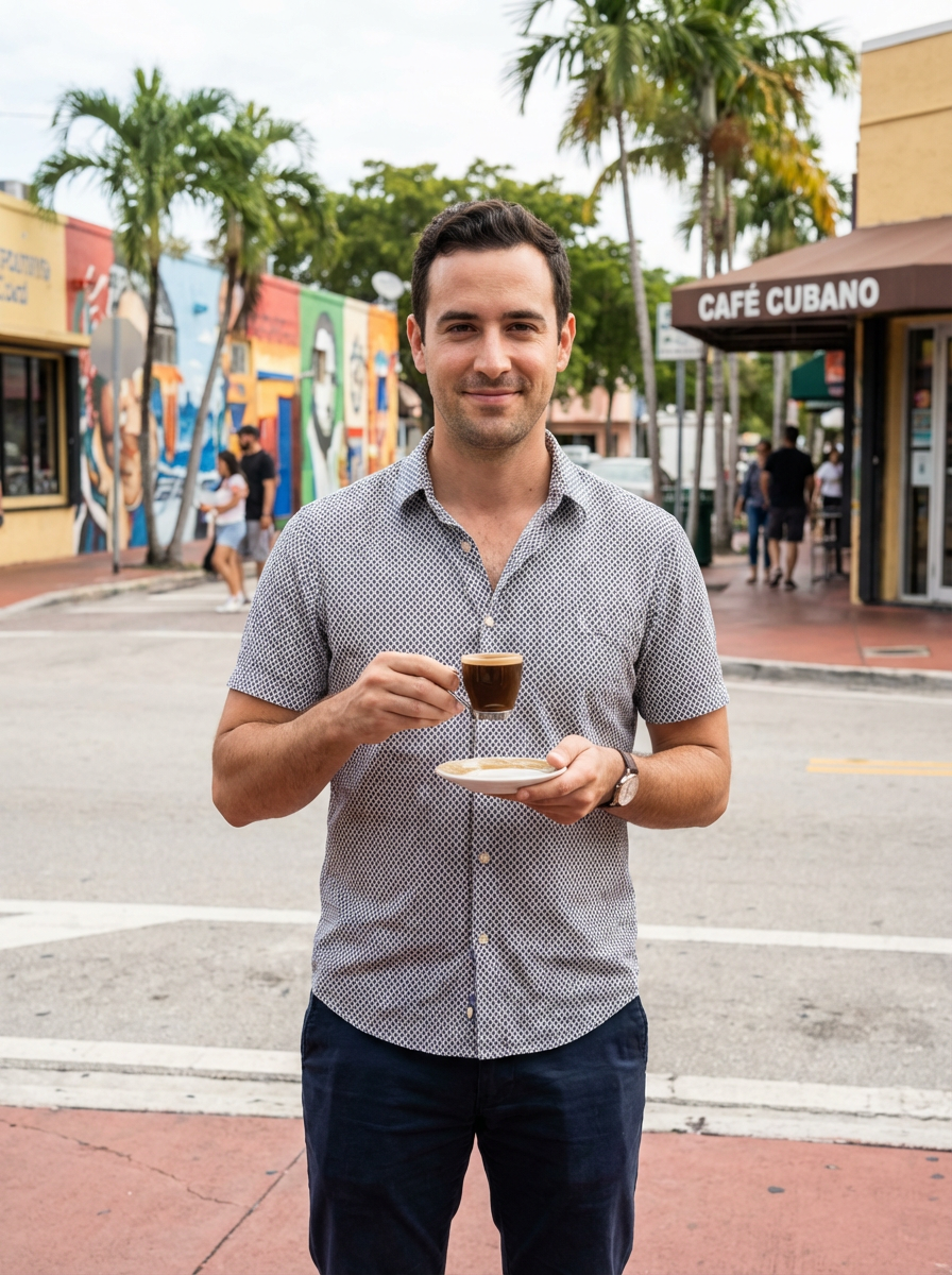 model at Little Havana, Calle Ocho, Cuban coffee in hand, colorful cultural setting
